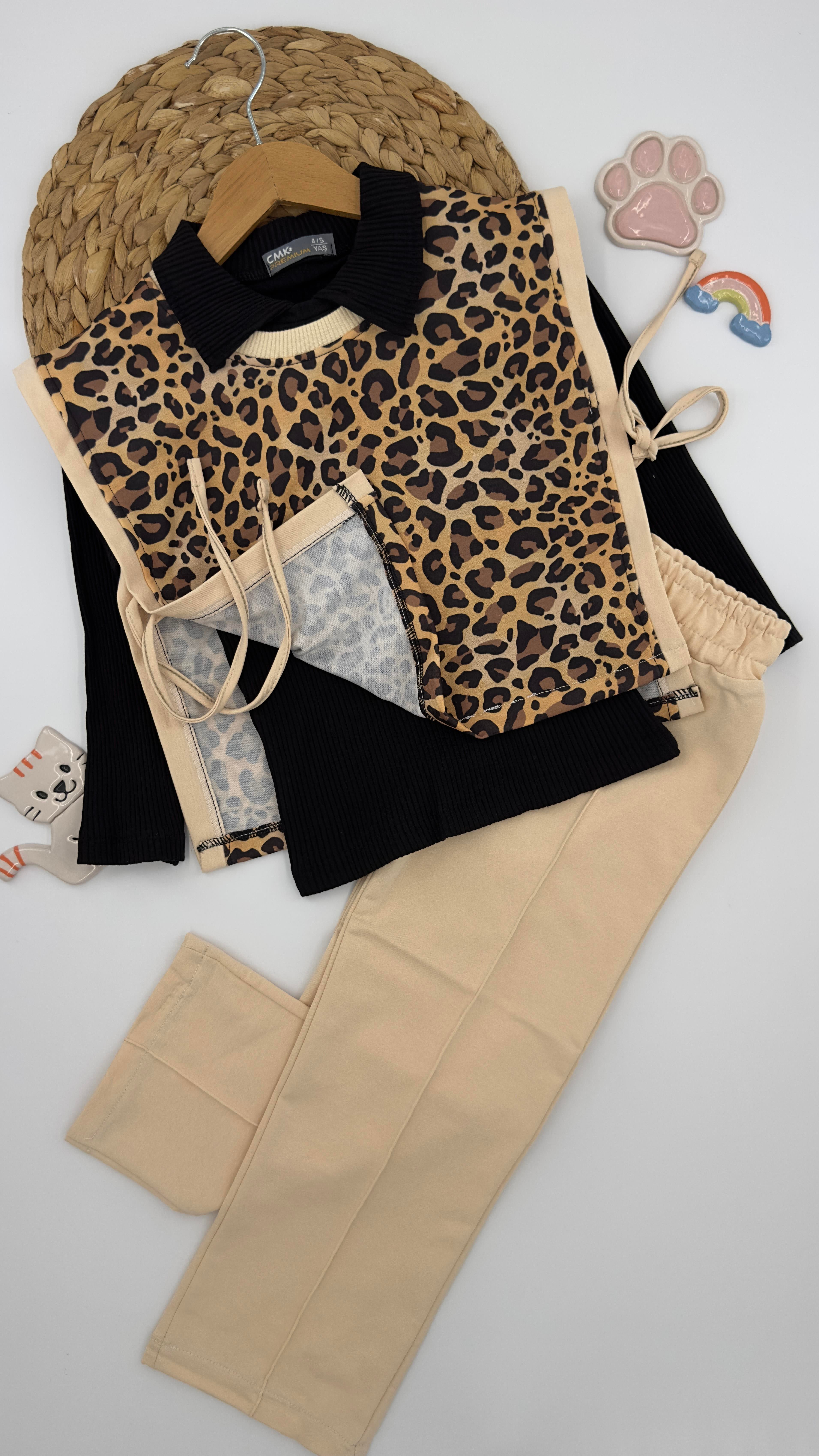 27090 Leopar Yaka Detaylı Süveterli Üçlü Takım KREM
