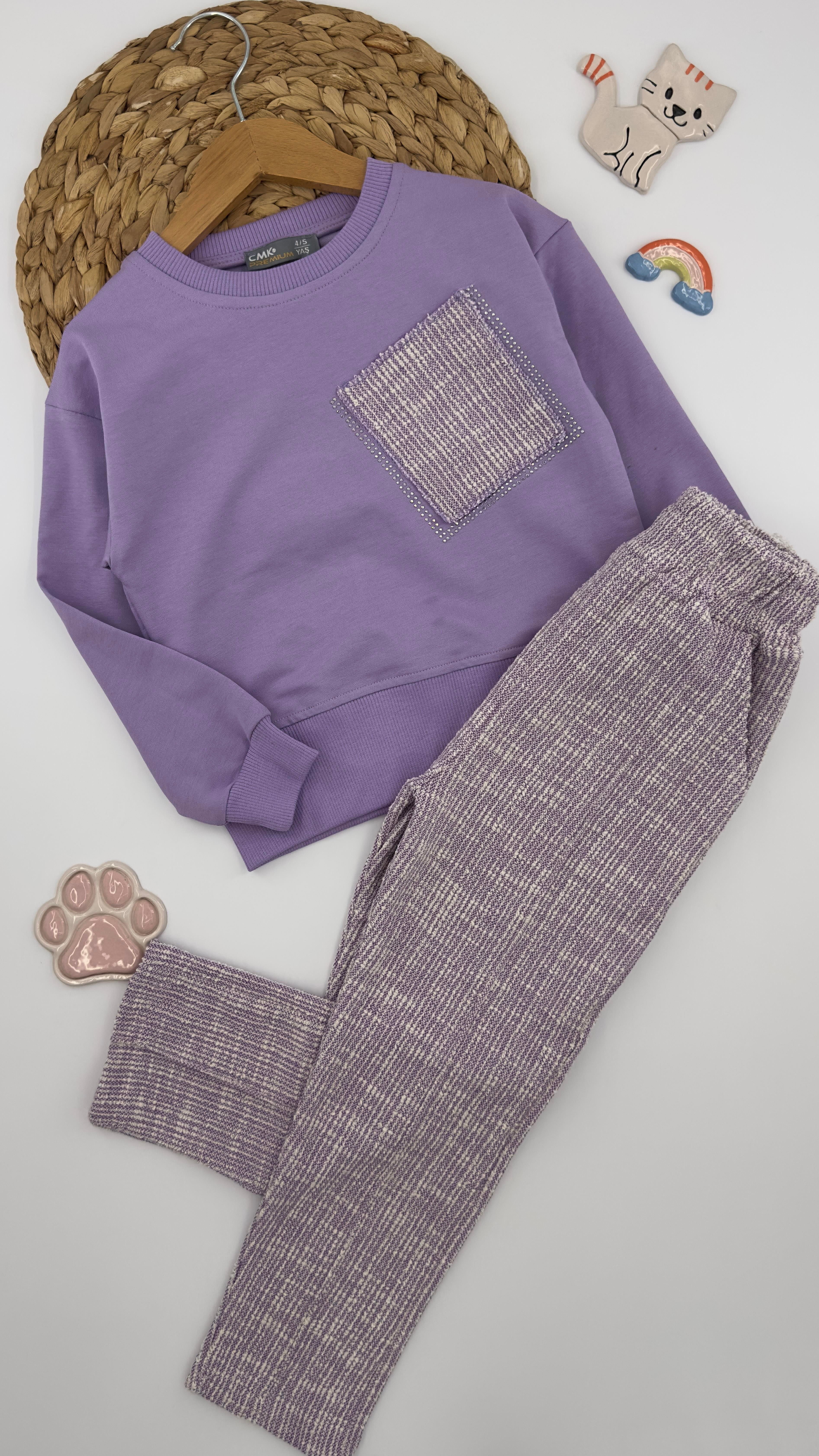 27090 Sahte Cep Görünümlü Tüvit Pantolonlu Kız Takım LİLA