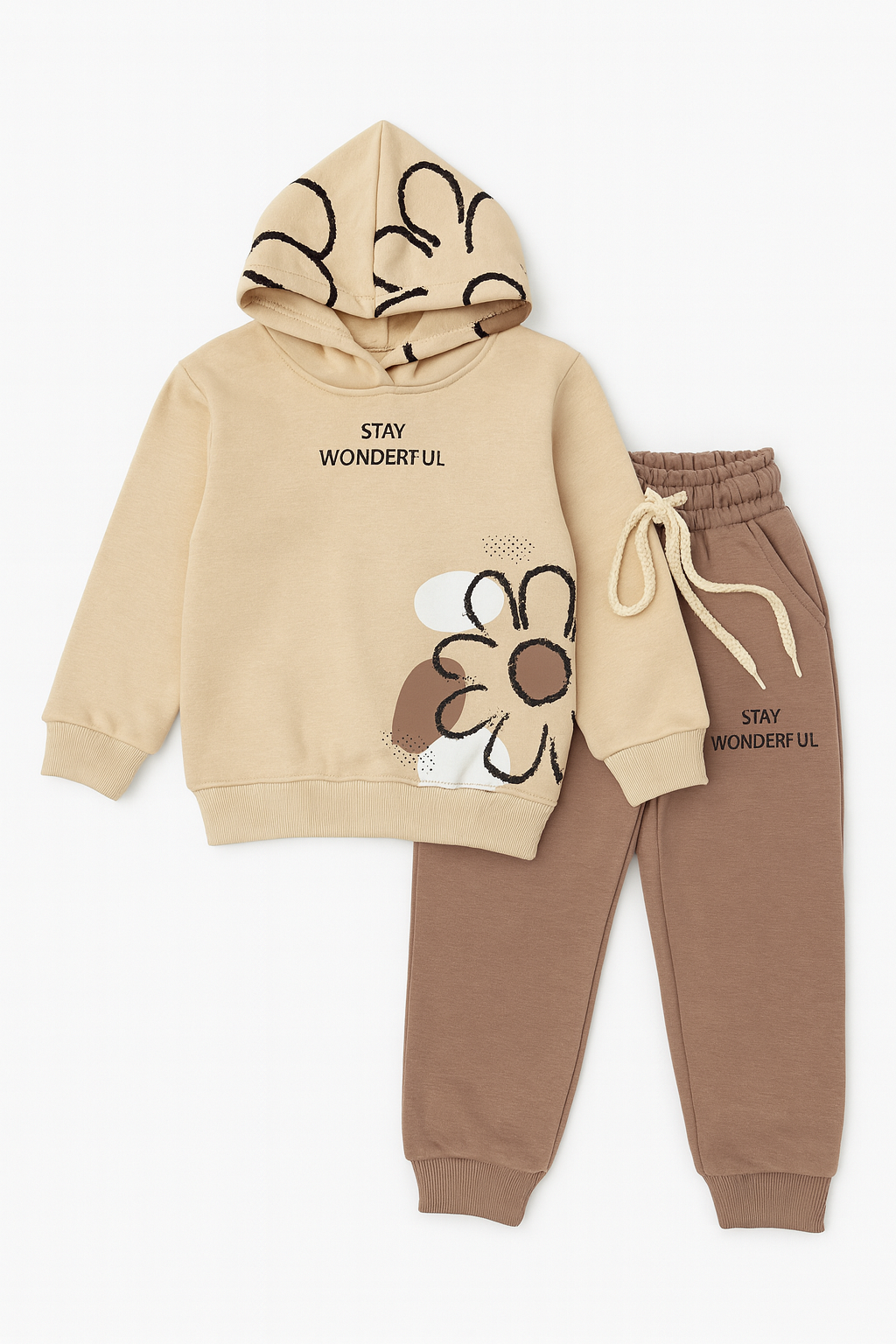 2811 Stay Wonderful Baskılı Kapişonlu Şardonlu Takım (3-6 Yaş) KAHVE
