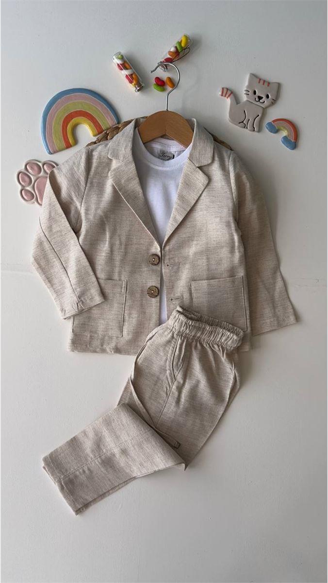 2854 Klasik Keten Kumaş T-Shirtlü Erkek Takım (6-9 Yaş) KREM