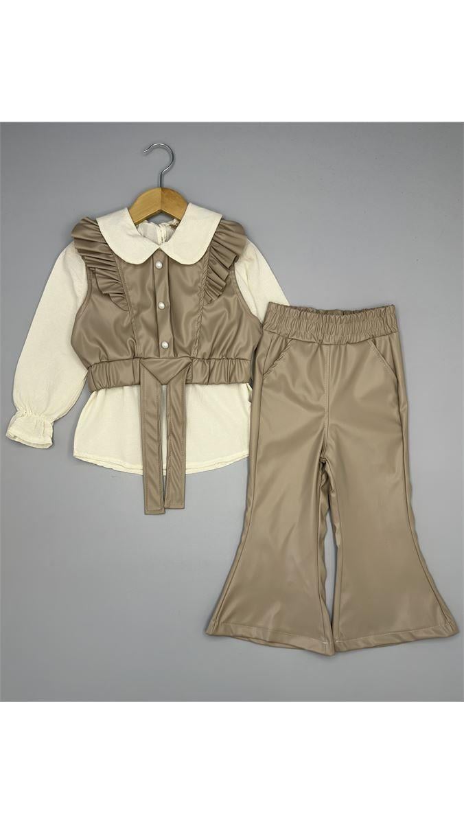 30562 Deri Yelek Pantolon Gömleki Üçlü Takım KREM