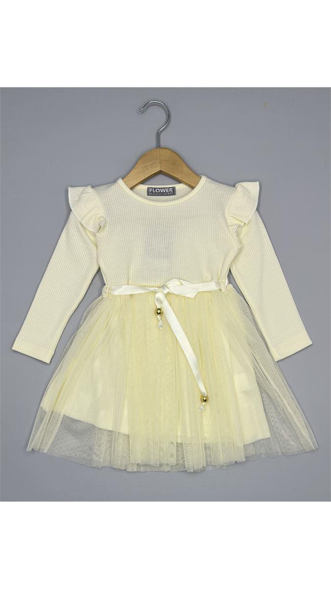 3695 Burgulu Kumaş Tüllü Elbise KREM