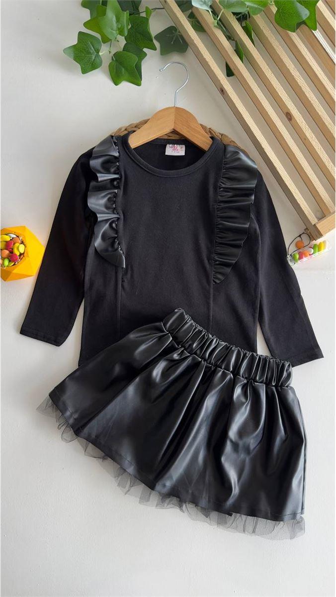 4118 Deri Fırfırlı Tüllü Deri Etekli Takım SİYAH