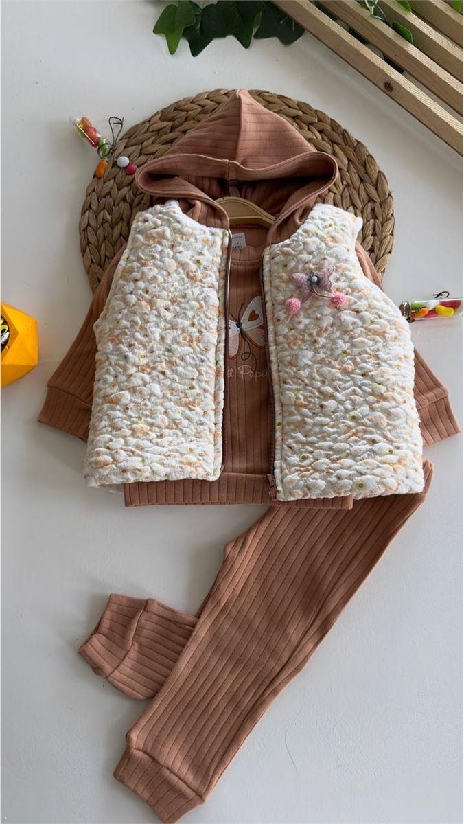 5104 Kelebekli Yelekli Üçlü Kız Takım KAHVERENGİ