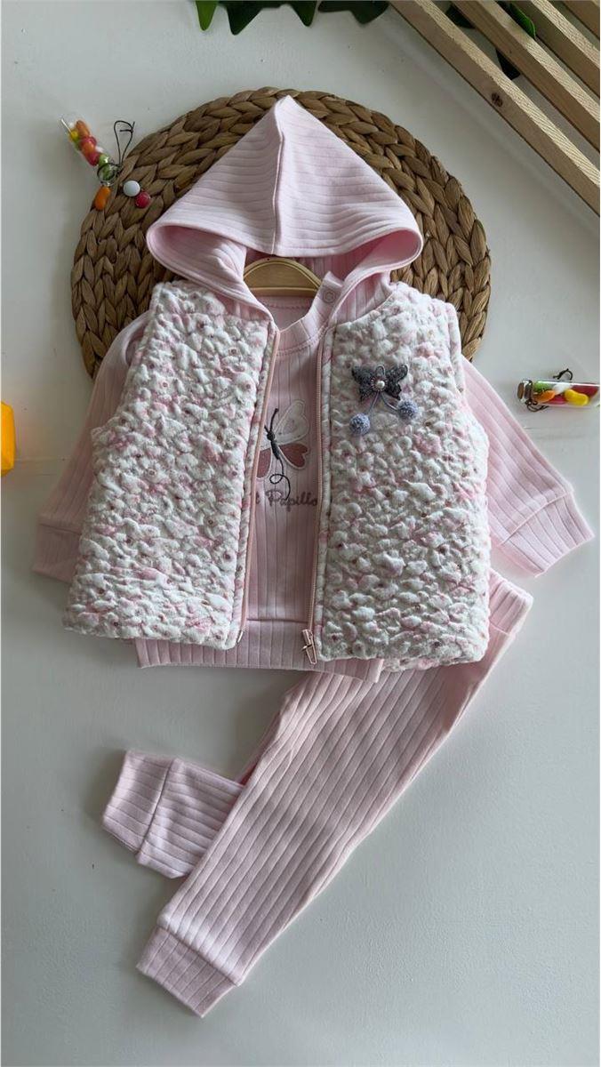 5104 Kelebekli Yelekli Üçlü Kız Takım PEMBE