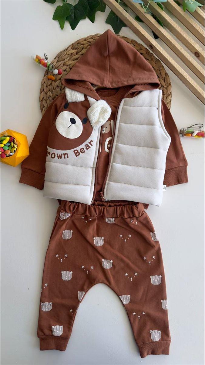 5125 Brown Bear Peluş Detaylı Üçlü Erkek Takım KAHVERENGİ