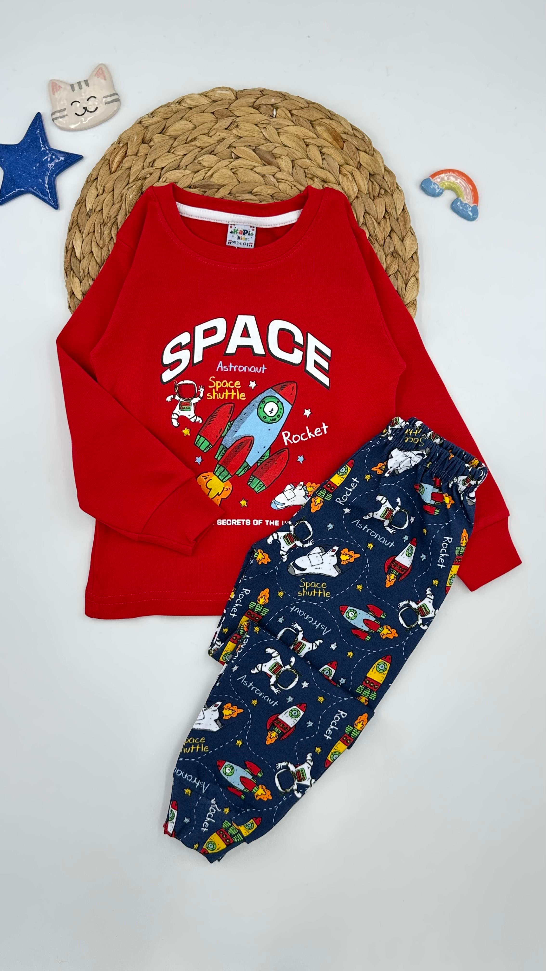 7114 Uzay Mekiği Desenli Erkek Çocuk Pijama Takımı KIRMIZI